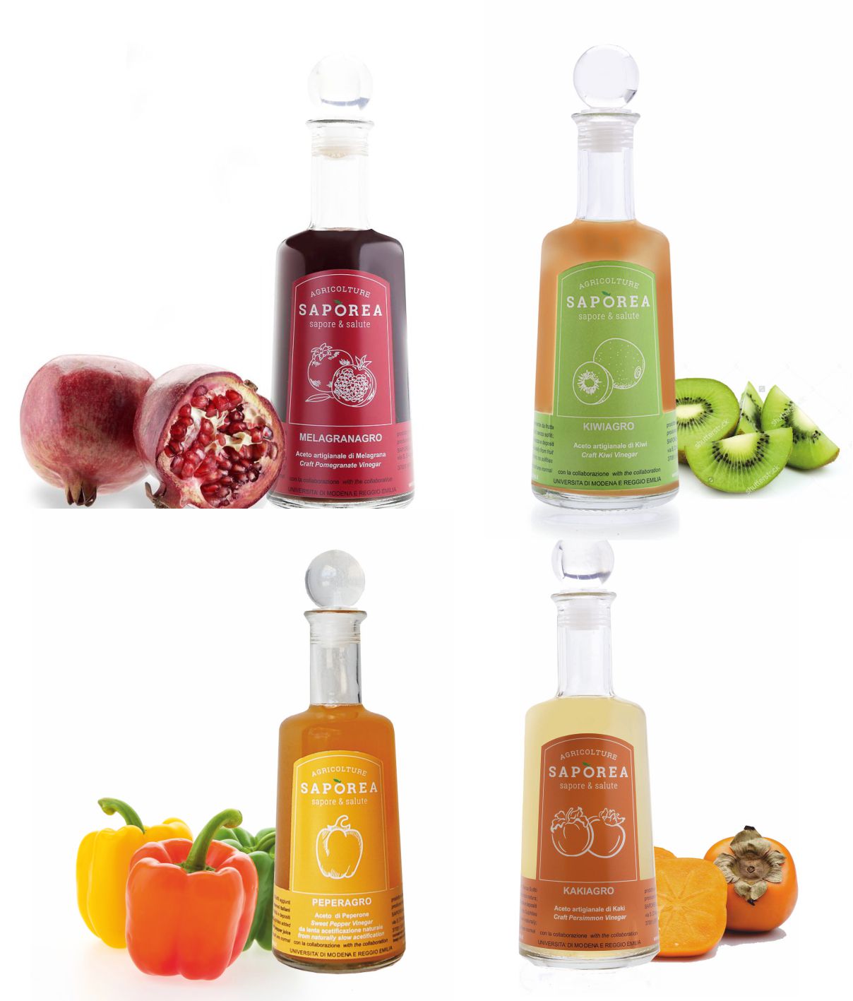 Quattro bottiglie da 250 ml di aceto di Melagrana (agrodolce), di Kiwi (agrodolce) di Kaki e di Peperone